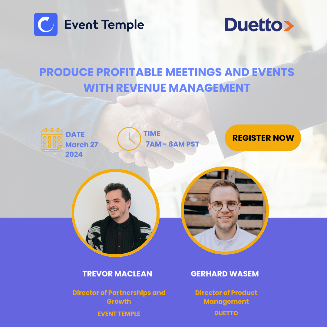 Join us for our latest 1 on 1 interview Webinar with Trevor MacLean, Director of Partnerships and Growth at Event Temple and Gerhard Wasem, ex-founder at MICERate and current Director of Product Management at Duetto, where they dive into how you can use revenue management to turn your meetings into a profit engine for your hotel!