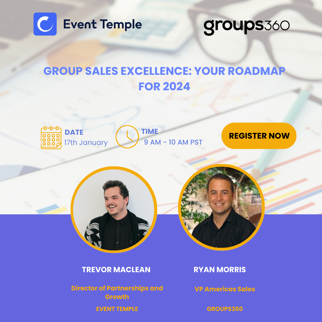 Join us on the 17th of January at 9AM PST to get access to this exclusive opportunity to learn from Ryan Morris, VP of Sales Americas, Groups360, and Trevor MacLean, Director of Partnerships and Growth, Event Temple as they dive into trends and tips to help you grow your group business.